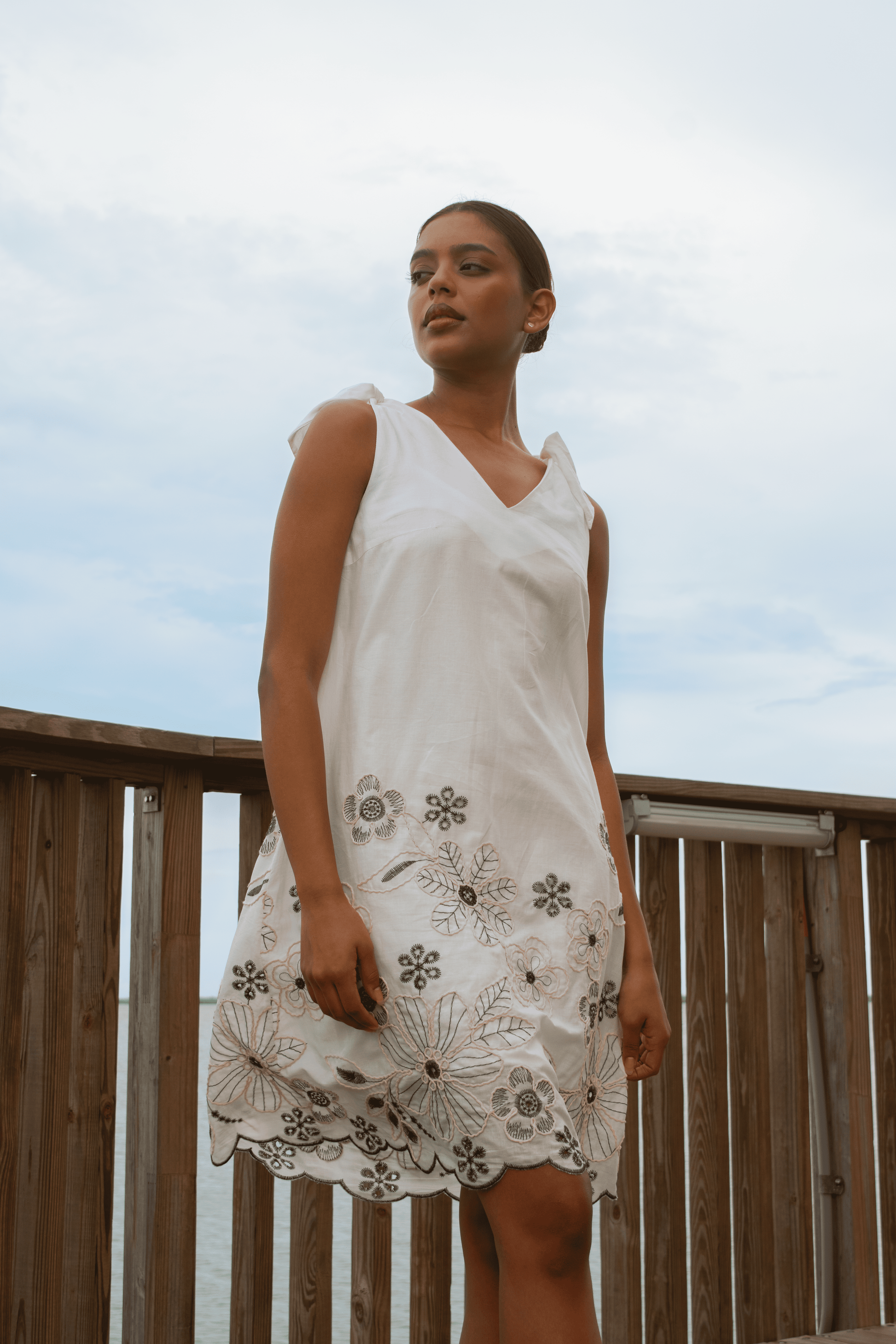 Encapsula la ligereza y la libertad de las aves que recorren la orilla del mar. Confeccionado en Algodón Bordado (Ojalillo) de un blanco inmaculado, es la pieza esencial para un verano chic y artesanal